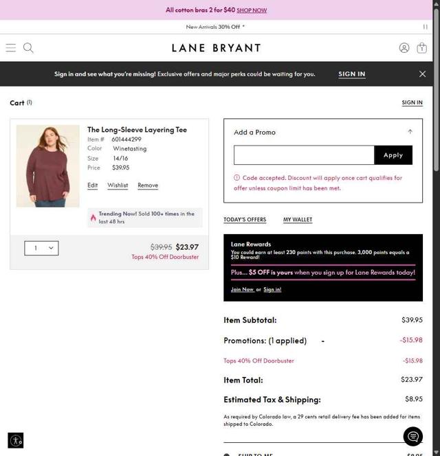 40100 off 100+ plus another 30 off at Lane Bryant via promo code