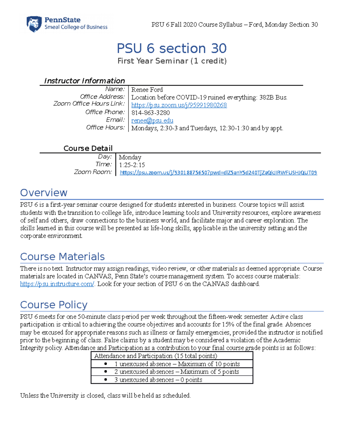 FORDPSU 6 Syllabus FA20Mondays PSU 6 Fall 2020 Course Syllabus