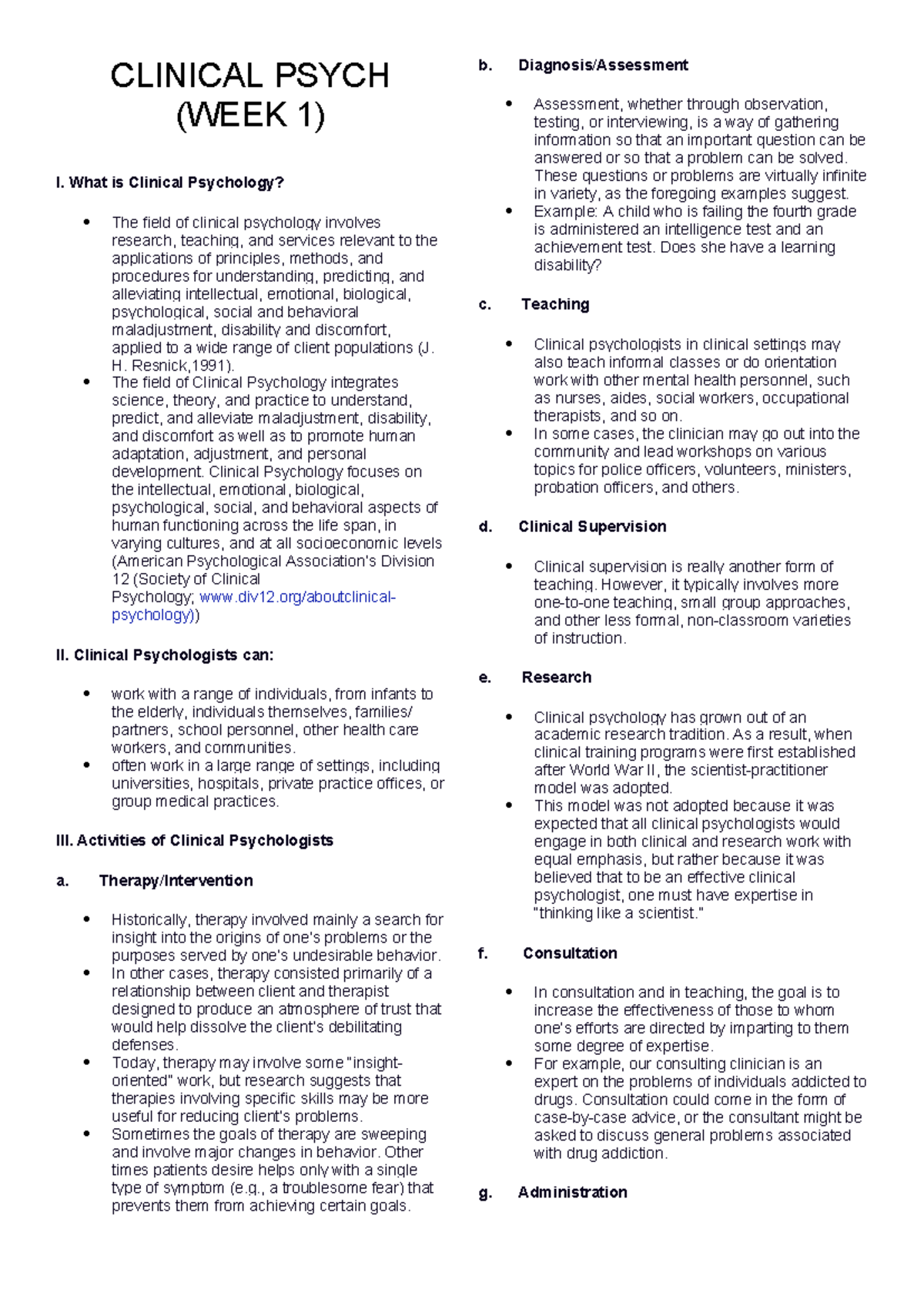 Clinical Psych ( Prelim) CLINICAL PSYCH (WEEK 1) I. What is Clinical