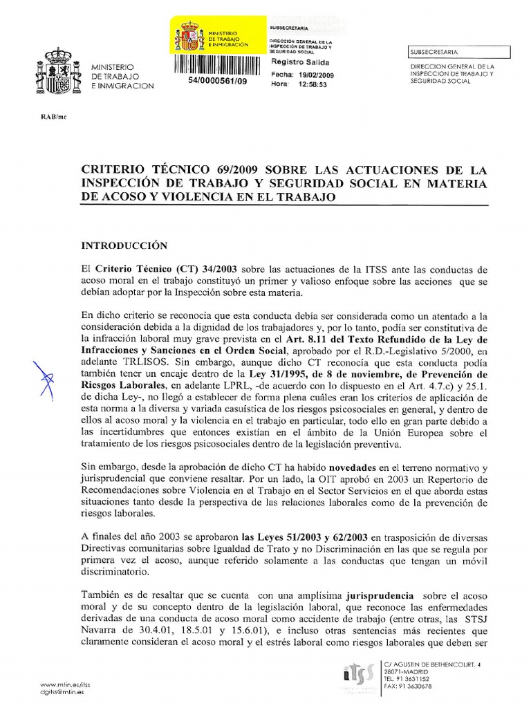 Criterio Tecnico 692009 Acoso y Violencia en El Trabajo PDF