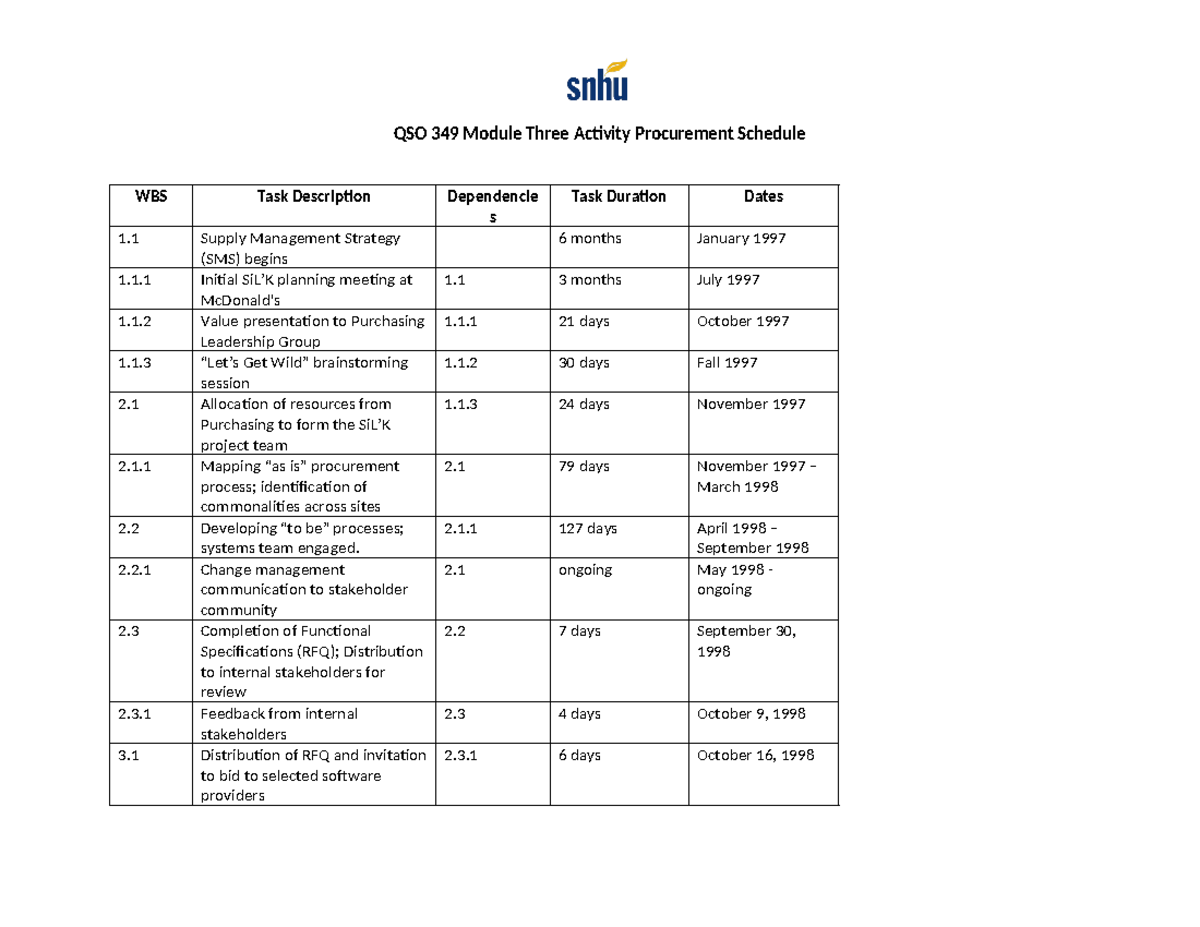 QSO 349 Week 3 Module Three Activity Procurement Schedule WBS QSO 349