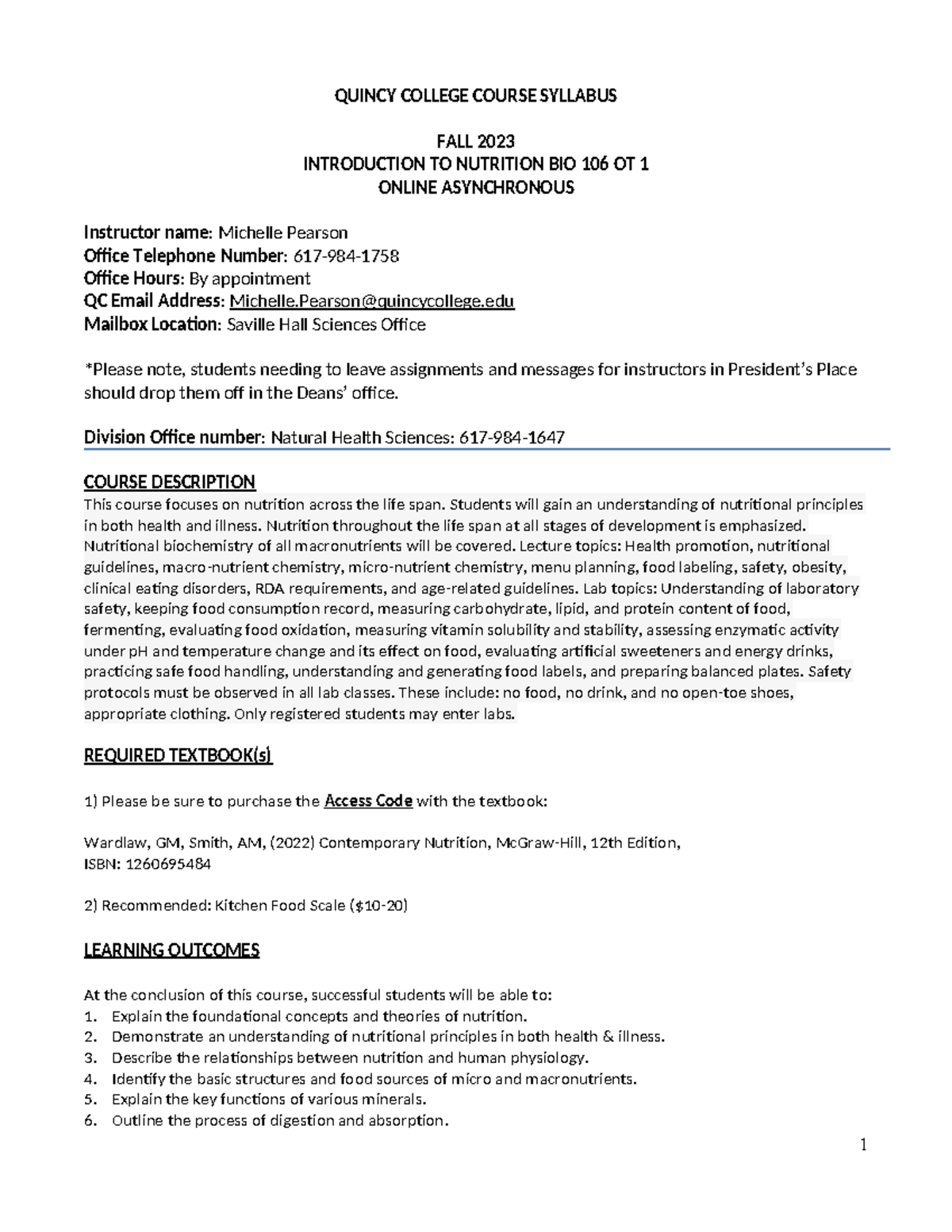 Syllabus Bio 106 Fall 2023 QUINCY COLLEGE COURSE SYLLABUS FALL 2023