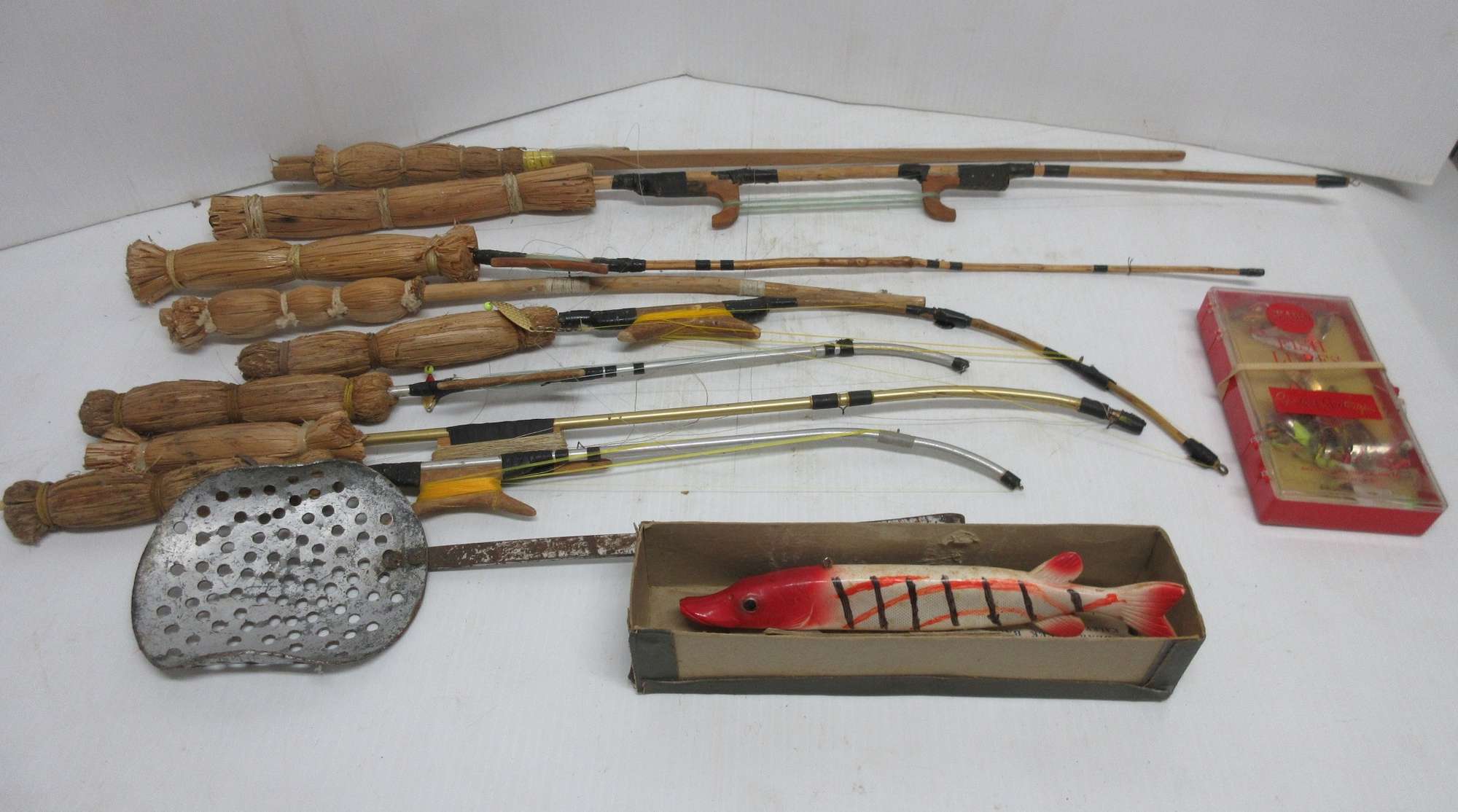 Albrecht Auctions Bucket of (8) Reed Ice Fishing Poles, Two Made from