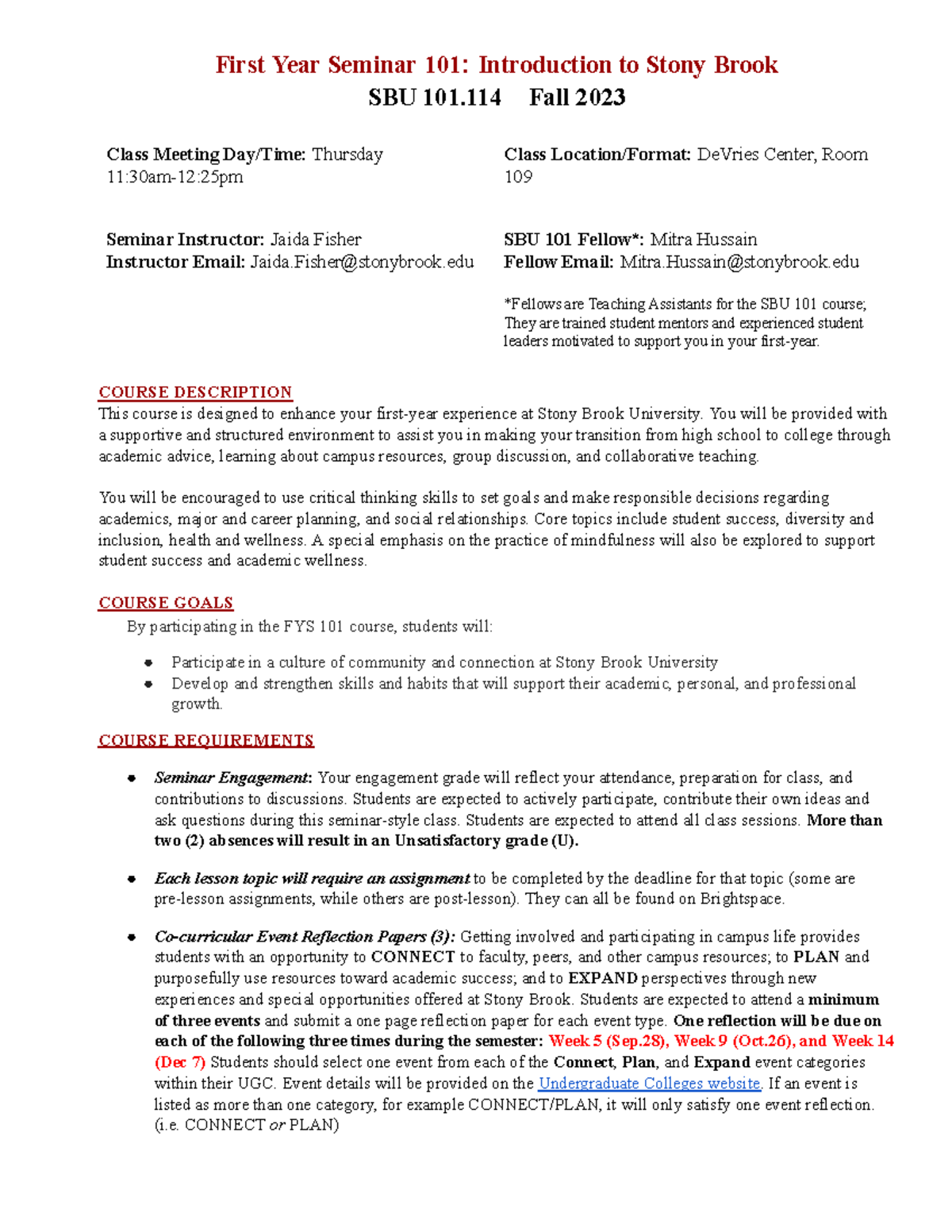 SBU 101 Course Syllabus Fall 2023 First Year Seminar 101