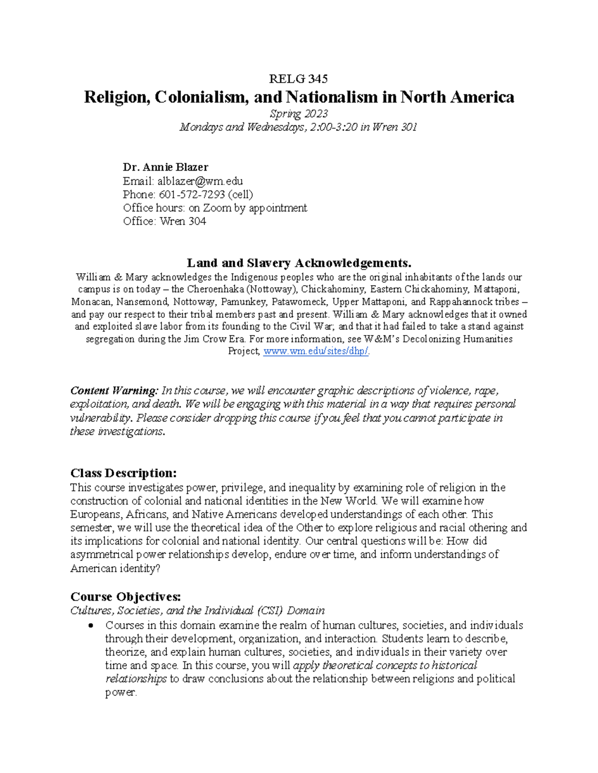 Spring 2023, RELG 345 syll RELG 345 Religion, Colonialism, and