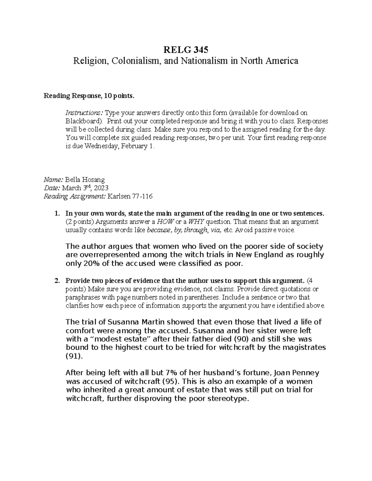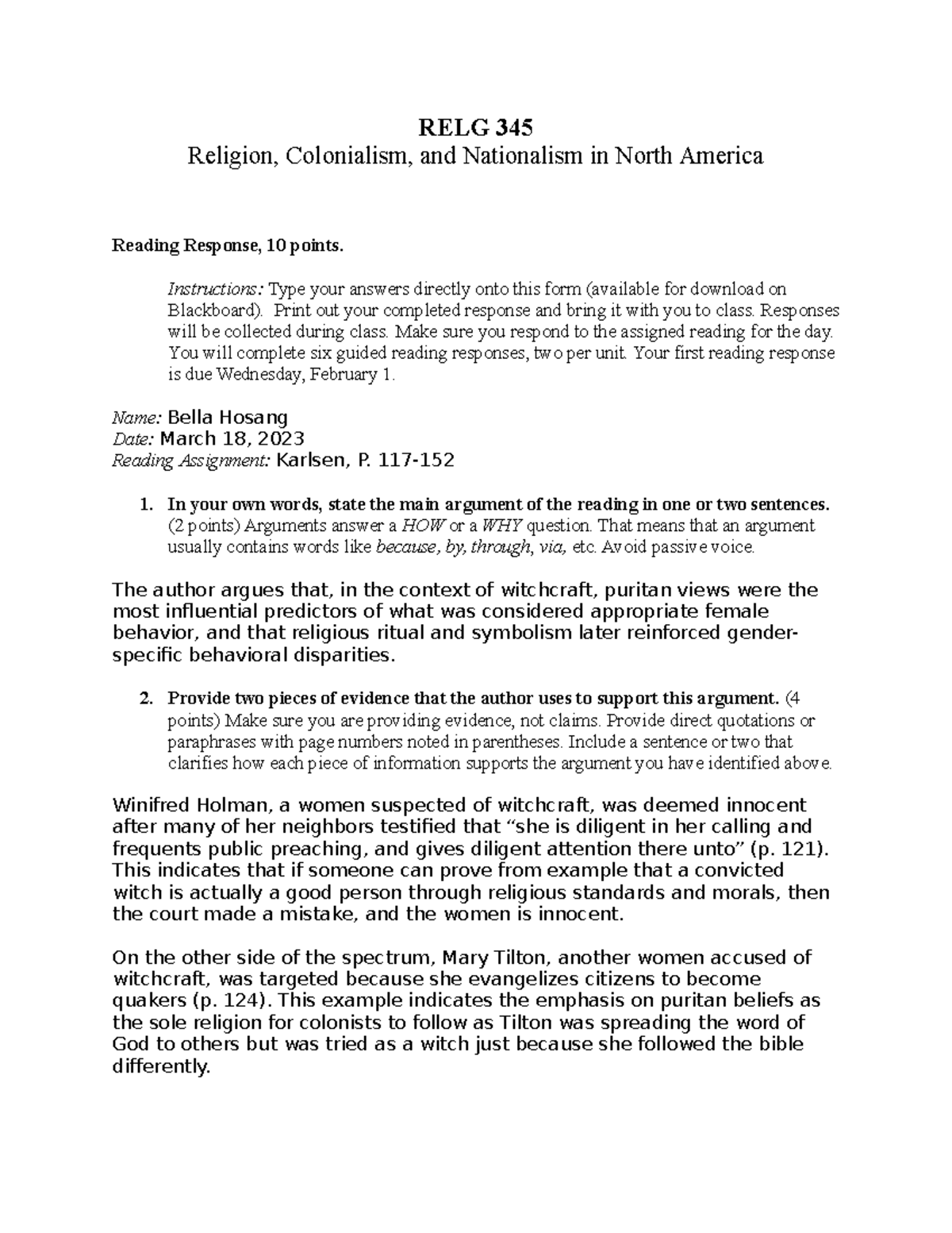 Reading Response 5 RELG 345 Religion, Colonialism, and Nationalism in