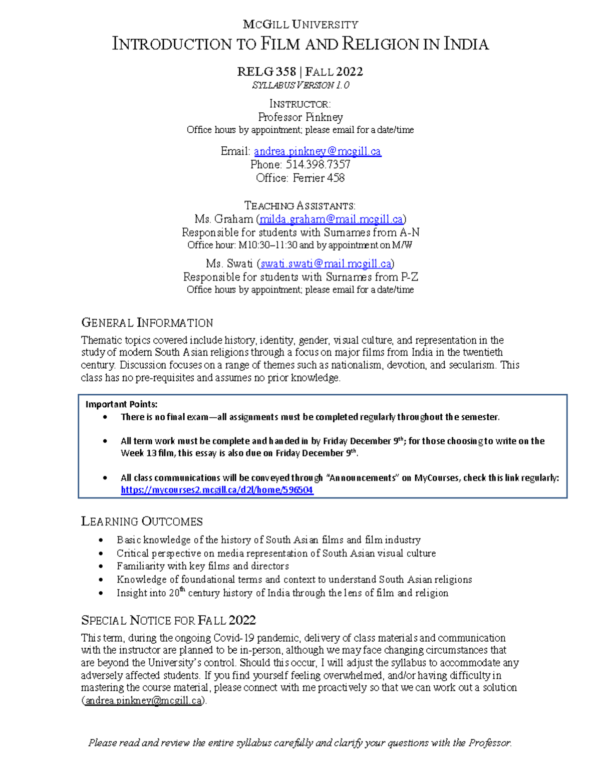 2022F RELG 358 Syllabus 1.0 AMP MCGILL UNIVERSITY INTRODUCTION TO