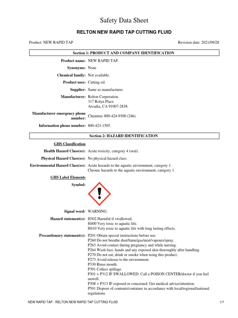 Relton New Rapid Tap Cutting Fluid PDF Dangerous Goods Toxicity