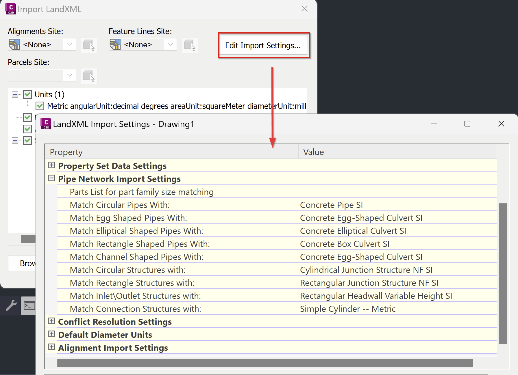 Import LandXML file for pipe networks and automatically adjust pipe