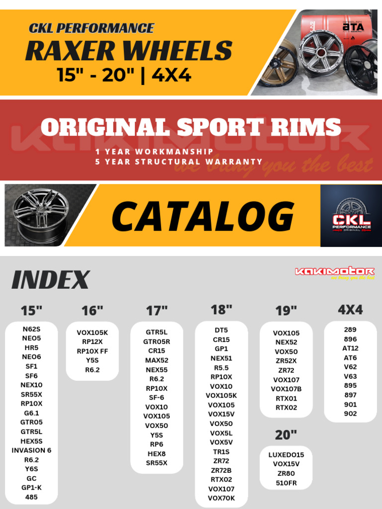 Rims Catalog - Finally, you will need software capable of opening and viewing PDF (Portable Document Format) files. This scalability is a dream for independent artists. Patterns also offer a sense of predictability and familiarity. History provides the context for our own ideas. How does a person move through a physical space? How does light and shadow make them feel? These same questions can be applied to designing a website. From this viewpoint, a chart can be beautiful not just for its efficiency, but for its expressiveness, its context, and its humanity. Once the pedal feels firm, you can lower the vehicle off the jack stands. When applied to personal health and fitness, a printable chart becomes a tangible guide for achieving wellness goals. This makes any type of printable chart an incredibly efficient communication device, capable of conveying complex information at a glance. What if a chart wasn't visual at all, but auditory? The field of data sonification explores how to turn data into sound, using pitch, volume, and rhythm to represent trends and patterns. NISSAN reserves the right to change specifications or design at any time without notice and without obligation. It is a masterpiece of information density and narrative power, a chart that functions as history, as data analysis, and as a profound anti-war statement. An interactive chart is a fundamentally different entity from a static one. The stark black and white has been replaced by vibrant, full-color photography. This posture ensures you can make steering inputs effectively while maintaining a clear view of the instrument cluster. As I got deeper into this world, however, I started to feel a certain unease with the cold, rational, and seemingly objective approach that dominated so much of the field. It is a bridge between our increasingly digital lives and our persistent need for tangible, physical tools. It was a tool designed for creating static images, and so much of early web design looked like a static print layout that had been put online. They enable artists to easily reproduce and share their work, expanding their reach and influence. Check the simple things first. However, hand knitting remained a cherished skill, particularly among women, who often used it as a means of contributing to their household income or as a leisure activity. In an age of seemingly endless digital solutions, the printable chart has carved out an indispensable role. The journey of any printable file, from its careful digital design to its final tangible form, represents a powerful act of creation. Sometimes it might be an immersive, interactive virtual reality environment. " On its surface, the term is a simple adjective, a technical descriptor for a file or document deemed suitable for rendering onto paper. The most powerful ideas are not invented; they are discovered. PNGs, with their support for transparency, are perfect for graphics and illustrations. It is also the other things we could have done with that money: the books we could have bought, the meal we could have shared with friends, the donation we could have made to a charity, the amount we could have saved or invested for our future. Its order is fixed by an editor, its contents are frozen in time by the printing press. It proved that the visual representation of numbers was one of the most powerful intellectual technologies ever invented. In addition to technical proficiency, learning to draw also requires cultivating a keen sense of observation and visual perception. " To fulfill this request, the system must access and synthesize all the structured data of the catalog—brand, color, style, price, user ratings—and present a handful of curated options in a natural, conversational way. A completely depleted battery can sometimes prevent the device from showing any signs of life. It can give you a website theme, but it cannot define the user journey or the content strategy. Sellers must provide clear instructions for their customers. 65 This chart helps project managers categorize stakeholders based on their level of influence and interest, enabling the development of tailored communication and engagement strategies to ensure project alignment and support. From its humble beginnings as a tool for 18th-century economists, the chart has grown into one of the most versatile and powerful technologies of the modern world. If your planter is not turning on, first ensure that the power adapter is securely connected to both the planter and a functioning electrical outlet. So, when we look at a sample of a simple toy catalog, we are seeing the distant echo of this ancient intellectual tradition, the application of the principles of classification and order not to the world of knowledge, but to the world of things. This sample is a world away from the full-color, photographic paradise of the 1990s toy book. The world is built on the power of the template, and understanding this fundamental tool is to understand the very nature of efficient and scalable creation. Lupi argues that data is not objective; it is always collected by someone, with a certain purpose, and it always has a context. This meant finding the correct Pantone value for specialized printing, the CMYK values for standard four-color process printing, the RGB values for digital screens, and the Hex code for the web. By externalizing health-related data onto a physical chart, individuals are empowered to take a proactive and structured approach to their well-being. We have seen how it leverages our brain's preference for visual information, how the physical act of writing on a chart forges a stronger connection to our goals, and how the simple act of tracking progress on a chart can create a motivating feedback loop. One of the strengths of black and white drawing is its ability to evoke a sense of timelessness and nostalgia. 94 This strategy involves using digital tools for what they excel at: long-term planning, managi