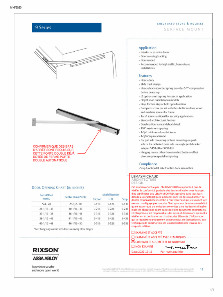 RIXSON SPEC SHEET 9 SERIES CHECKMATE & STOP LMAD A Resoumettre PDF