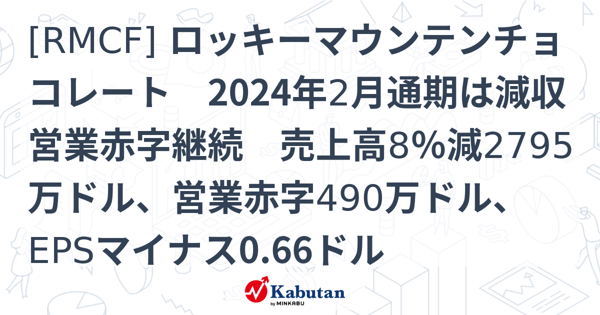[RMCF] ロッキーマウンテンチョコレート 2024年2月通期は減収営業赤字継続 売上高8%減2795万ドル、営業赤字490万ドル、EPS