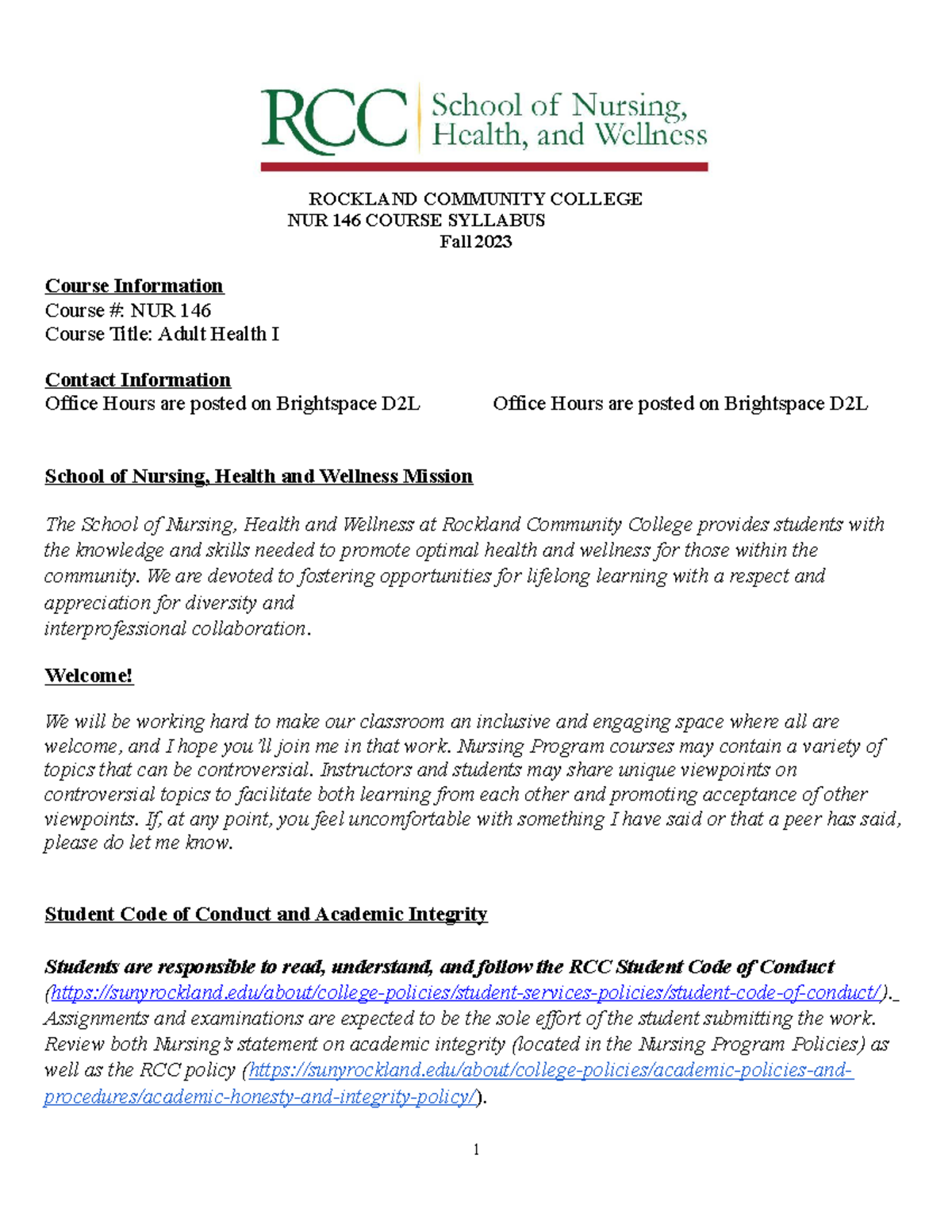 NUR 146 SyllabusFall 231 ROCKLAND COMMUNITY COLLEGE NUR 146 COURSE