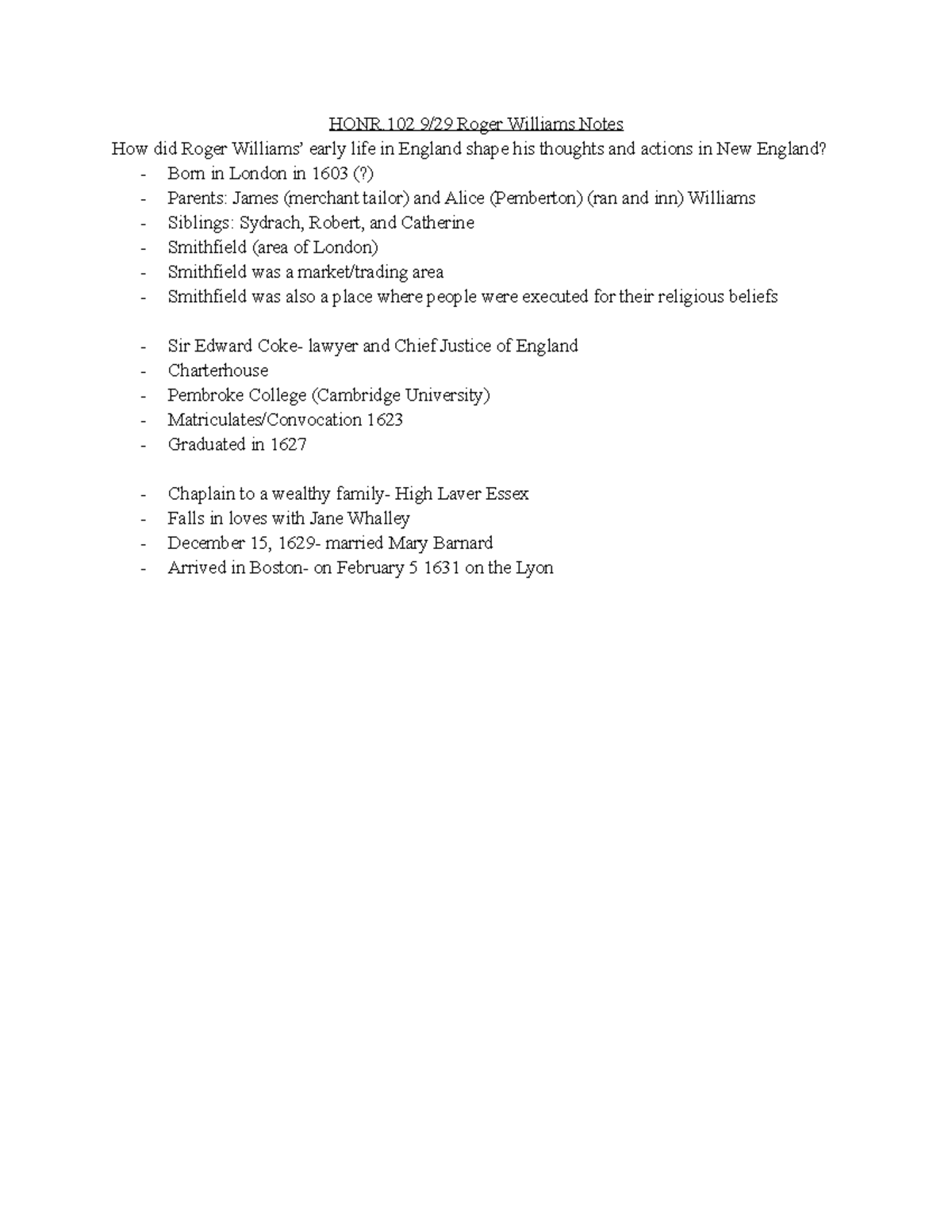 HONR.102 9 29 Roger Williams Notes HONR 9/29 Roger Williams Notes How