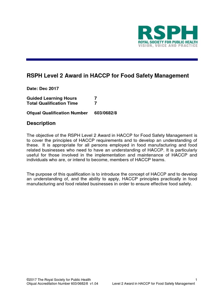 RSPH Level 4 Award in Haccp Management For Food Manufacturing PDF