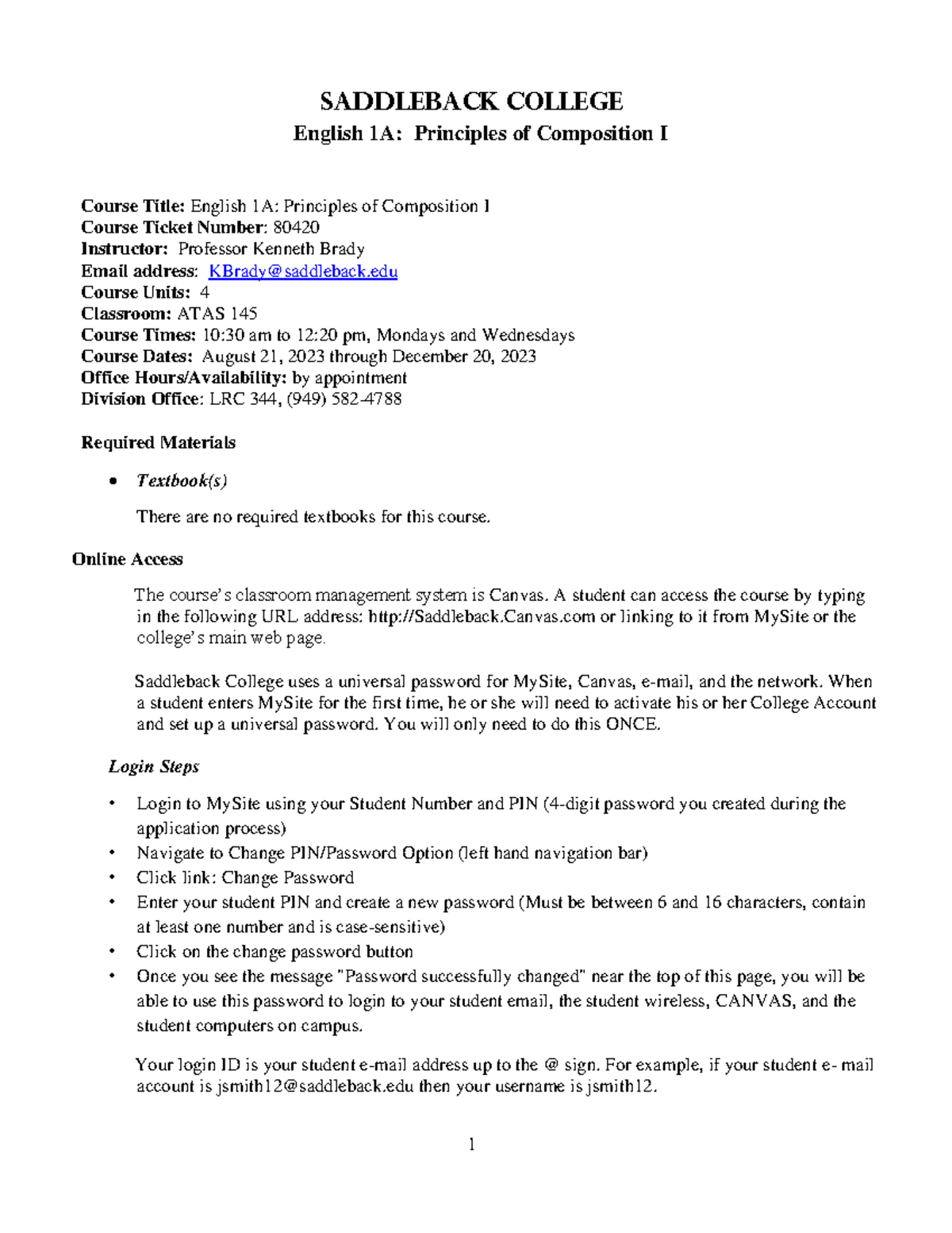 ENG 1A syllabus Saddleback College English 1A Principles of