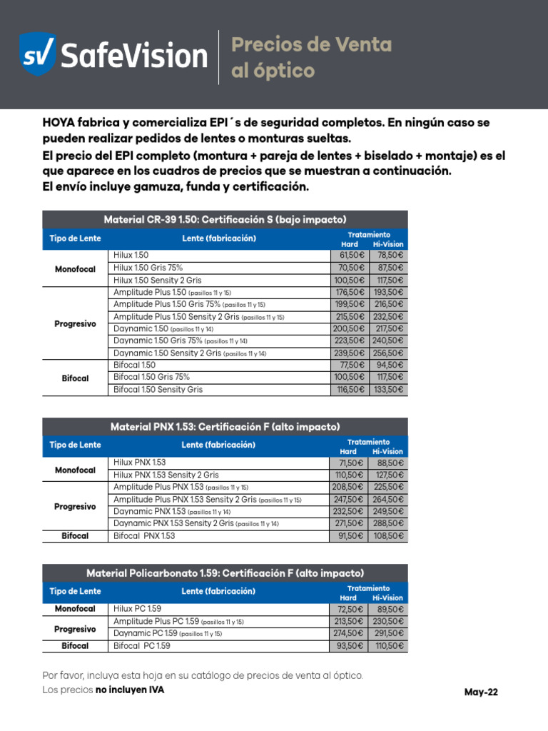 TARIFA PVO SAFEVISION 2022 Gafas Proteccion PDF Lentes Ojo