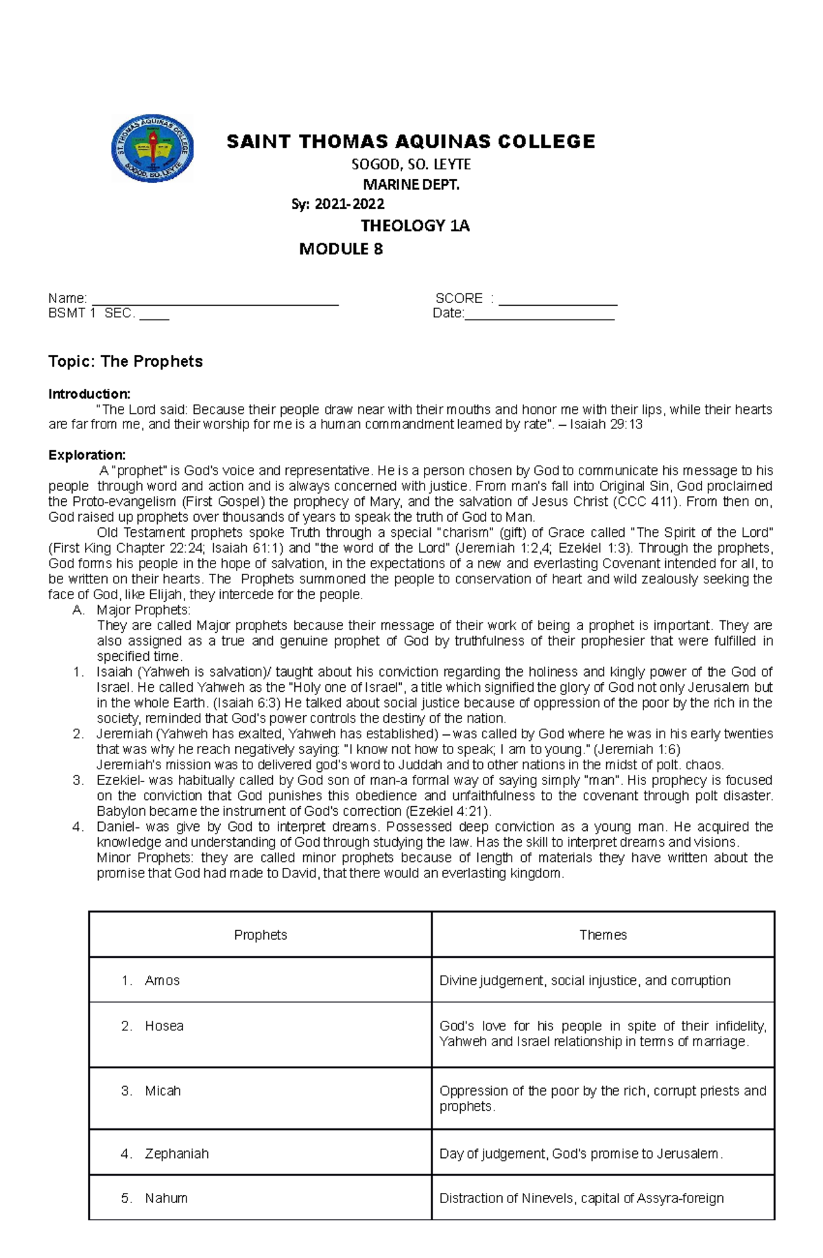 Prophets 8 Wala lang SAINT THOMAS AQUINAS COLLEGE SOGOD, SO. LEYTE