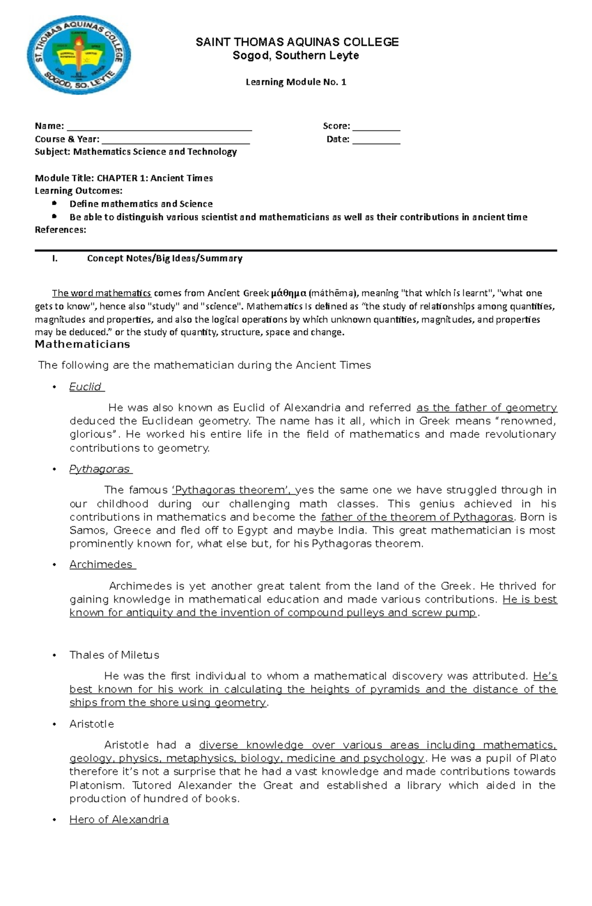 Curriculum St. Thomas Aquinas College