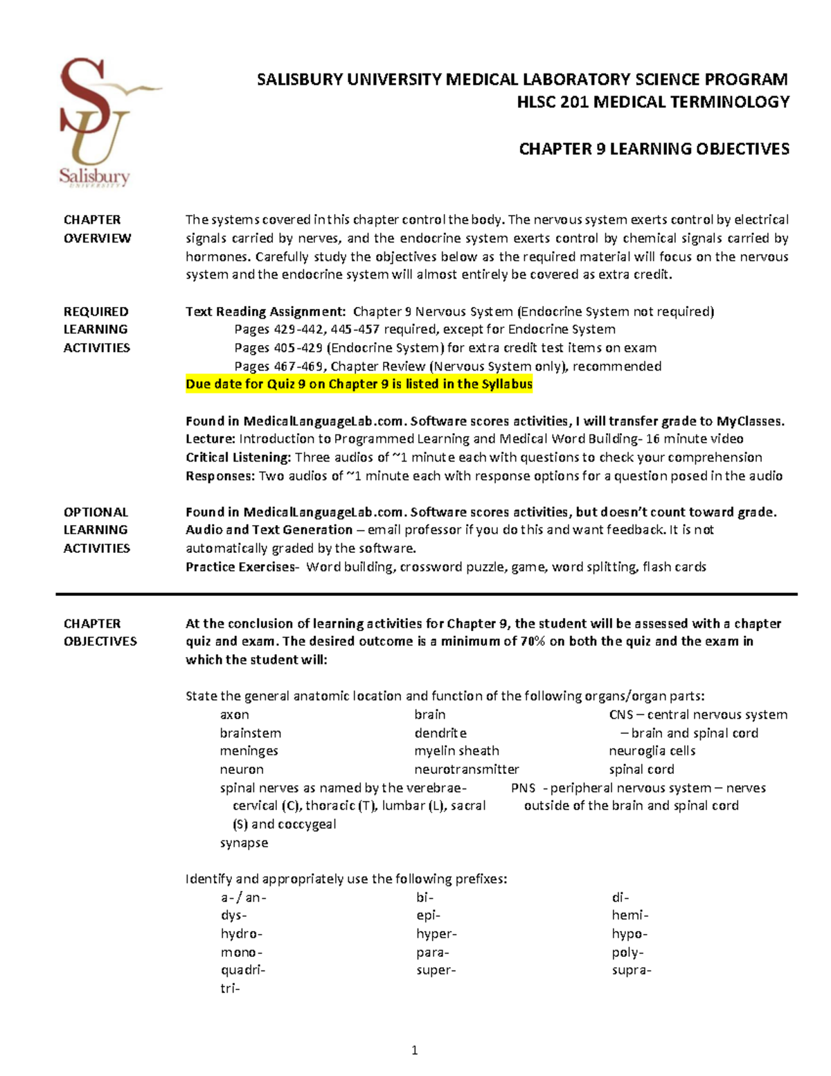 Chapter 9HLSC201Objectives 1 SALISBURY UNIVERSITY MEDICAL LABORATORY