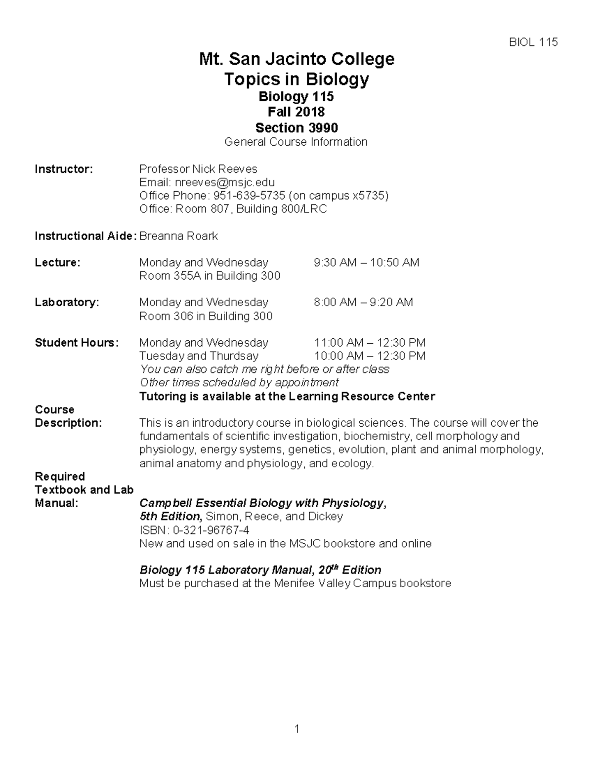 Syllabus Bio 115 Mt. San Jacinto College Topics in Biology Biology
