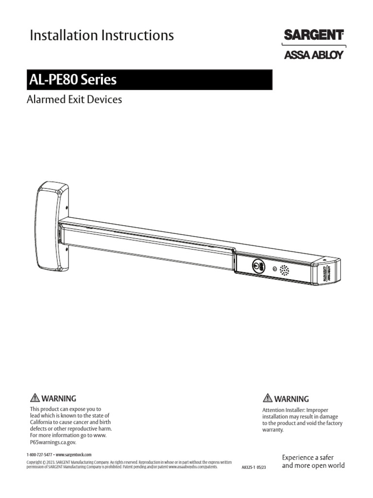 Sargent Pe80 Series Al Alarmed Exit Devices Installation Instructions