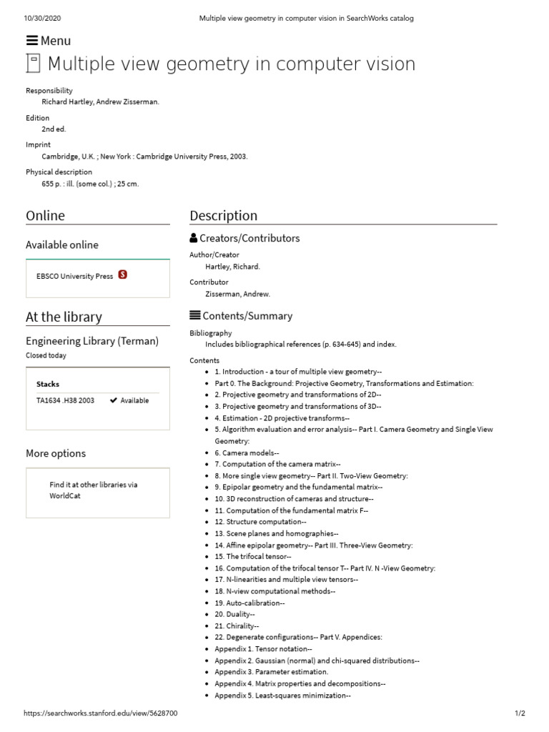 Multiple View Geometry in Computer Vision in SearchWorks Catalog PDF