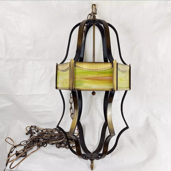 Mid Century 1960s Iron & Colored Glass 3 Light Swag Lamp