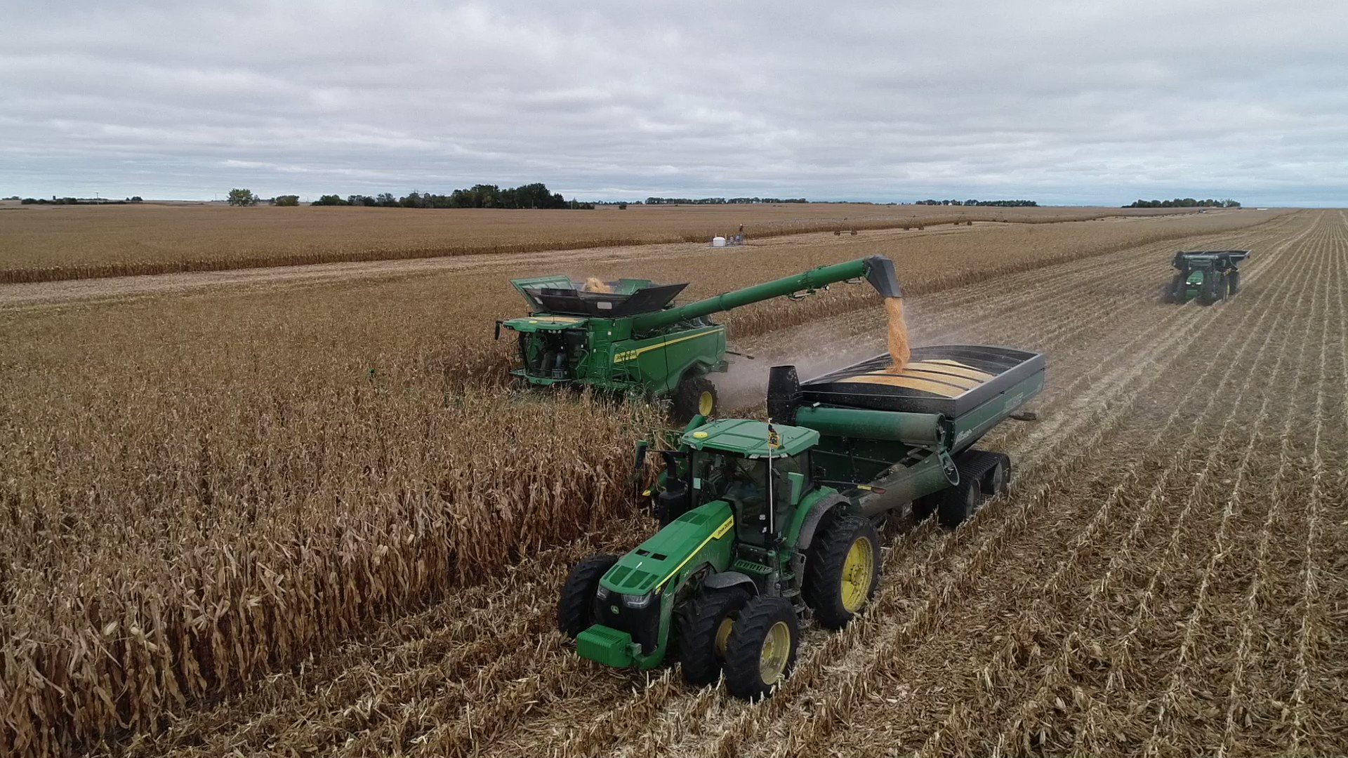 A green John Deere tractor driven by a person cultivates a cornfield at