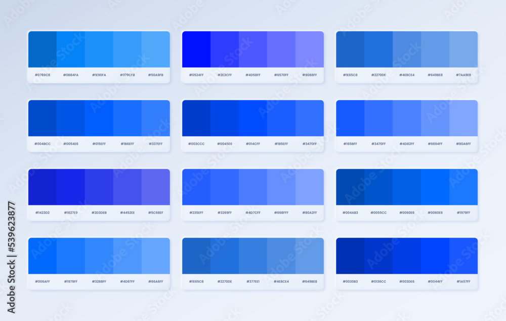 Blue trend color palette catalogue guide in RGB Hex. The palette shades