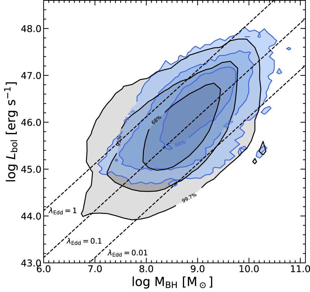 Distribution of quasars in the BH mass and bolometric luminosity space
