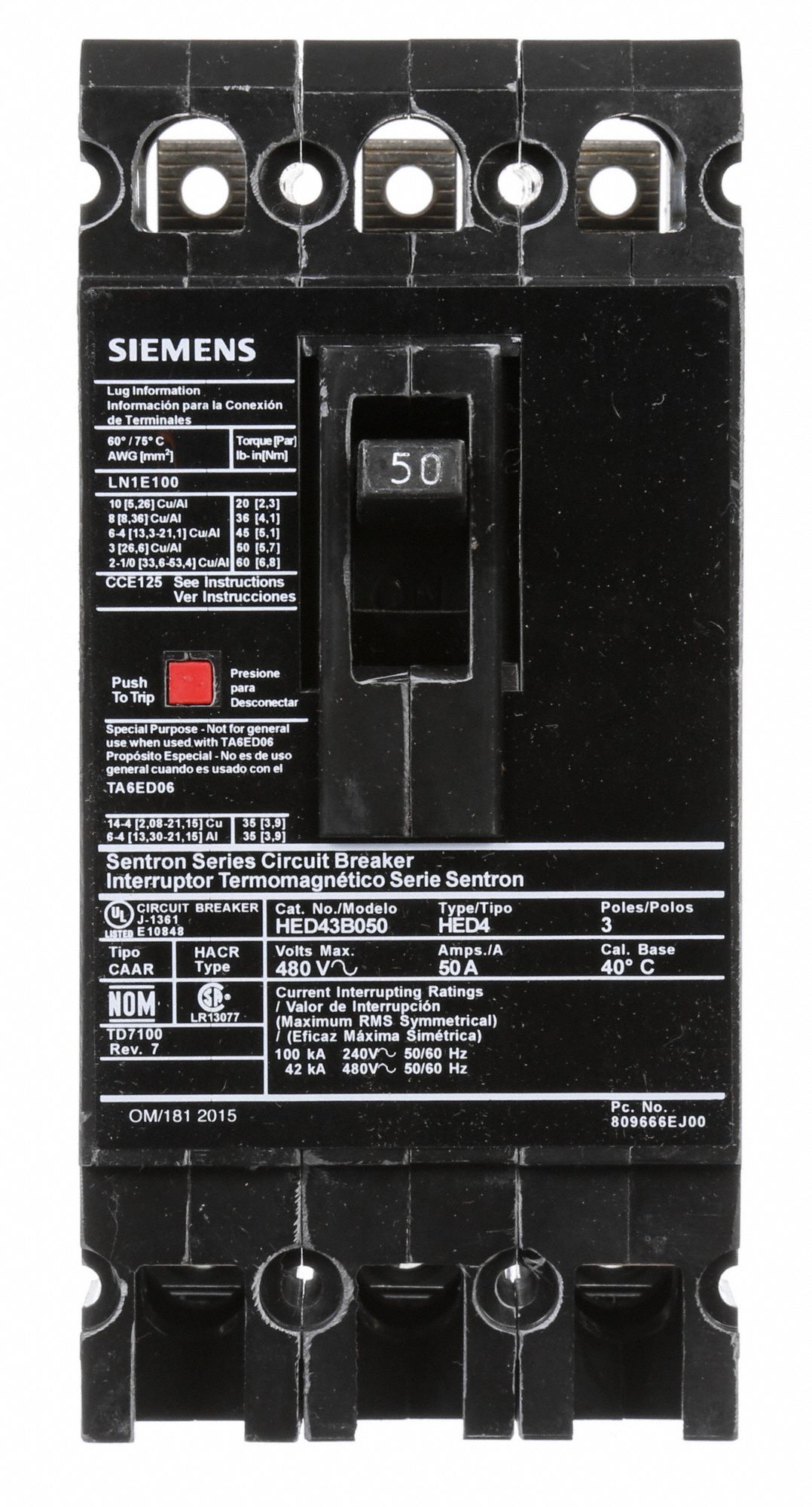 SIEMENS Molded Case Circuit Breaker 50 A Amps, 42kA at 480V AC, Fixed