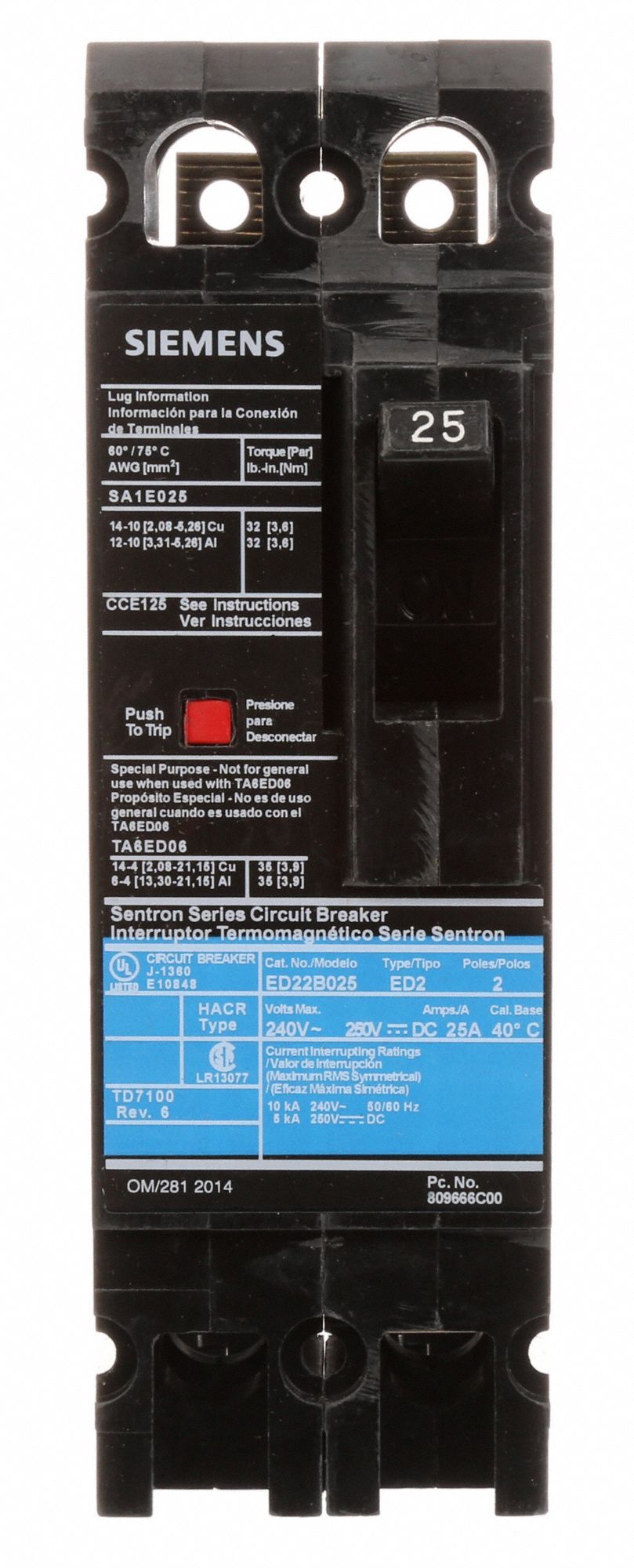 SIEMENS Molded Case Circuit Breaker 25 A Amps, 10kA at 240V AC, Fixed
