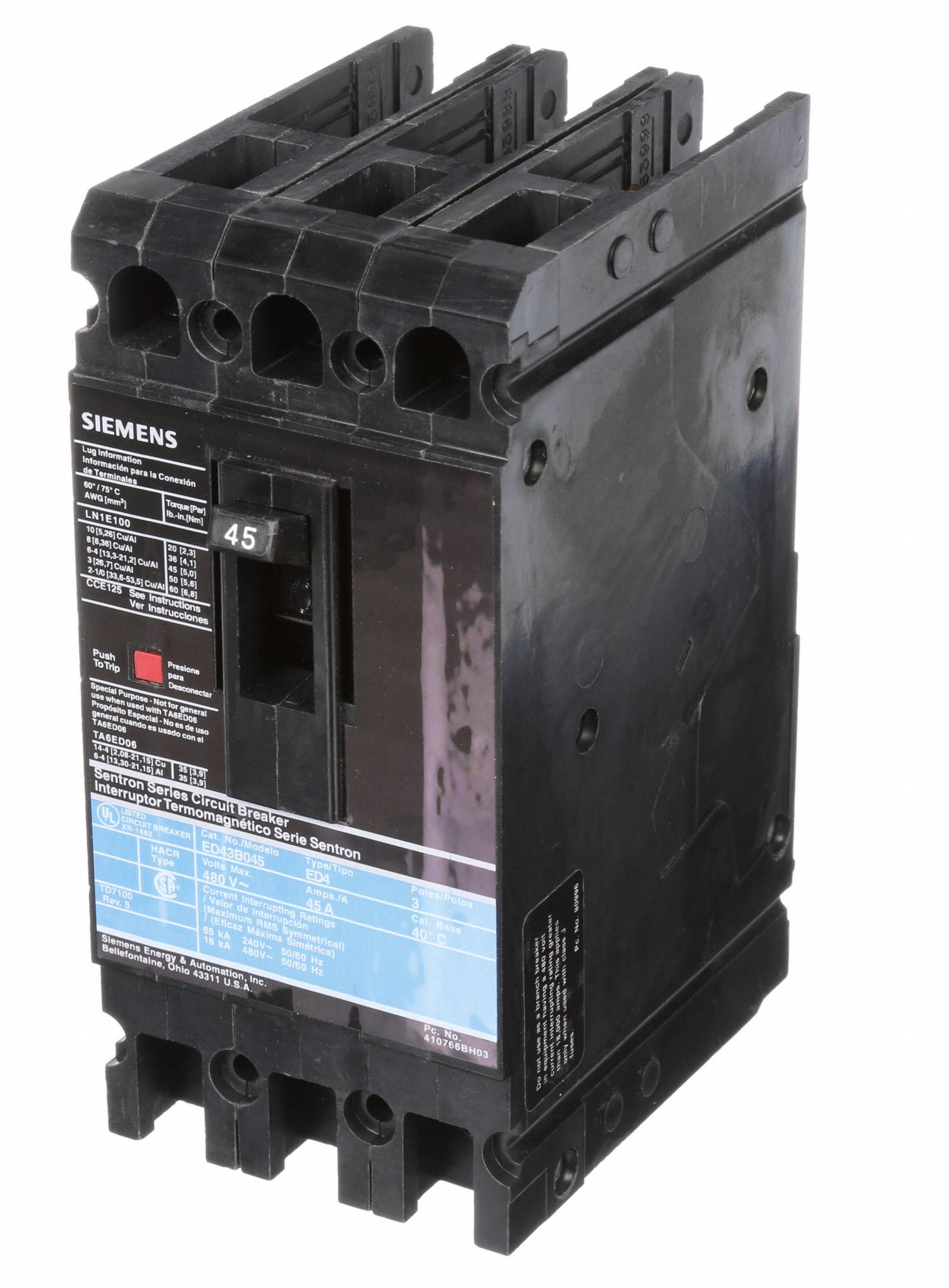 SIEMENS Molded Case Circuit Breaker 45 A Amps, 18kA at 480V AC, Fixed