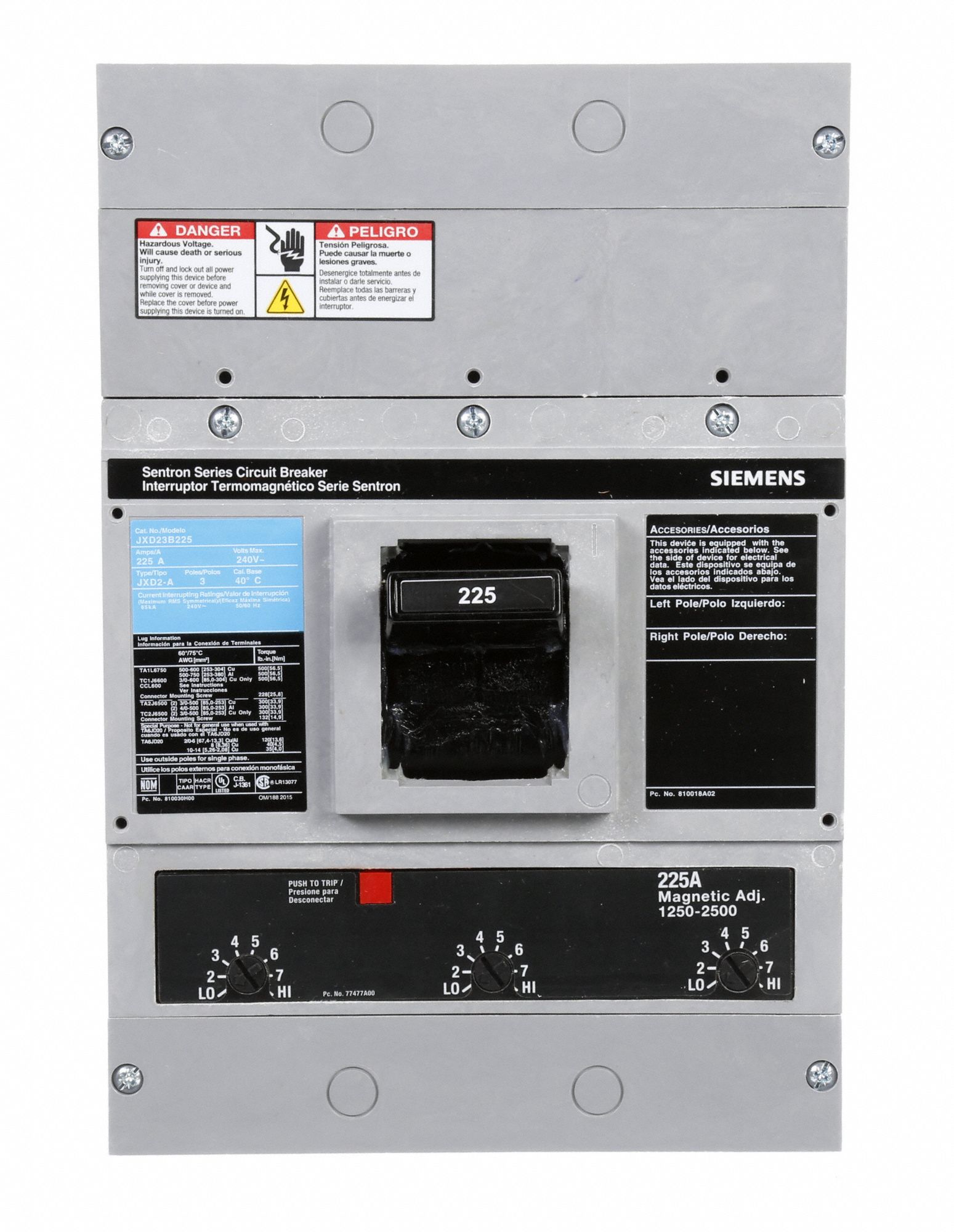 SIEMENS Molded Case Circuit Breaker 225 A Amps, 65kA at 240V AC, Fixed