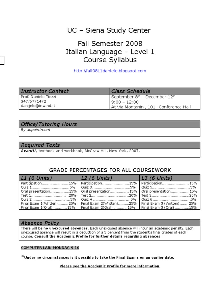 UC Siena Study Center Fall Semester 2008 Italian Language Level 1