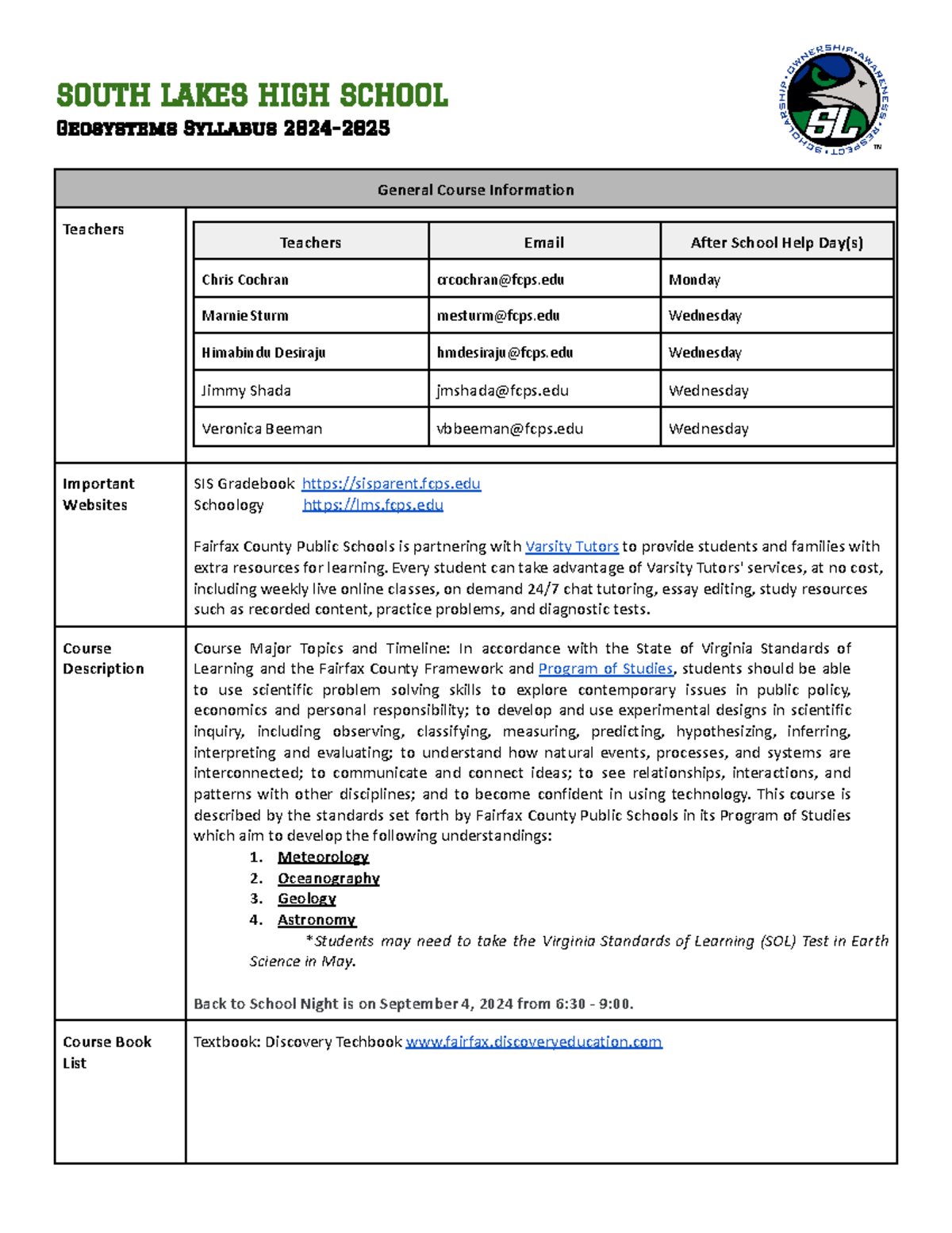 Geosystems SLHS Course Syllabus 20242025 Important Info & Policies