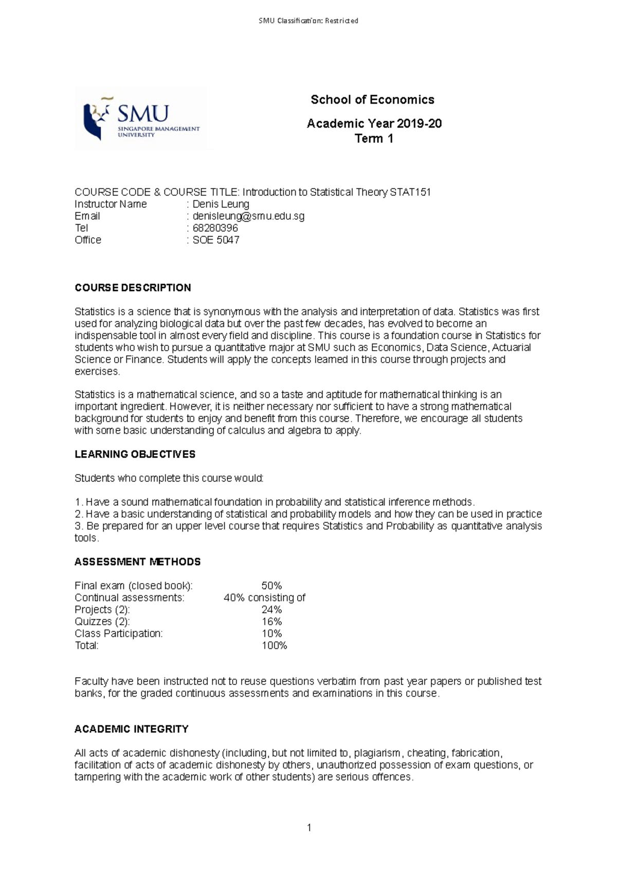 Stat151 Course Outline 201920 SMU Classification Restricted COURSE
