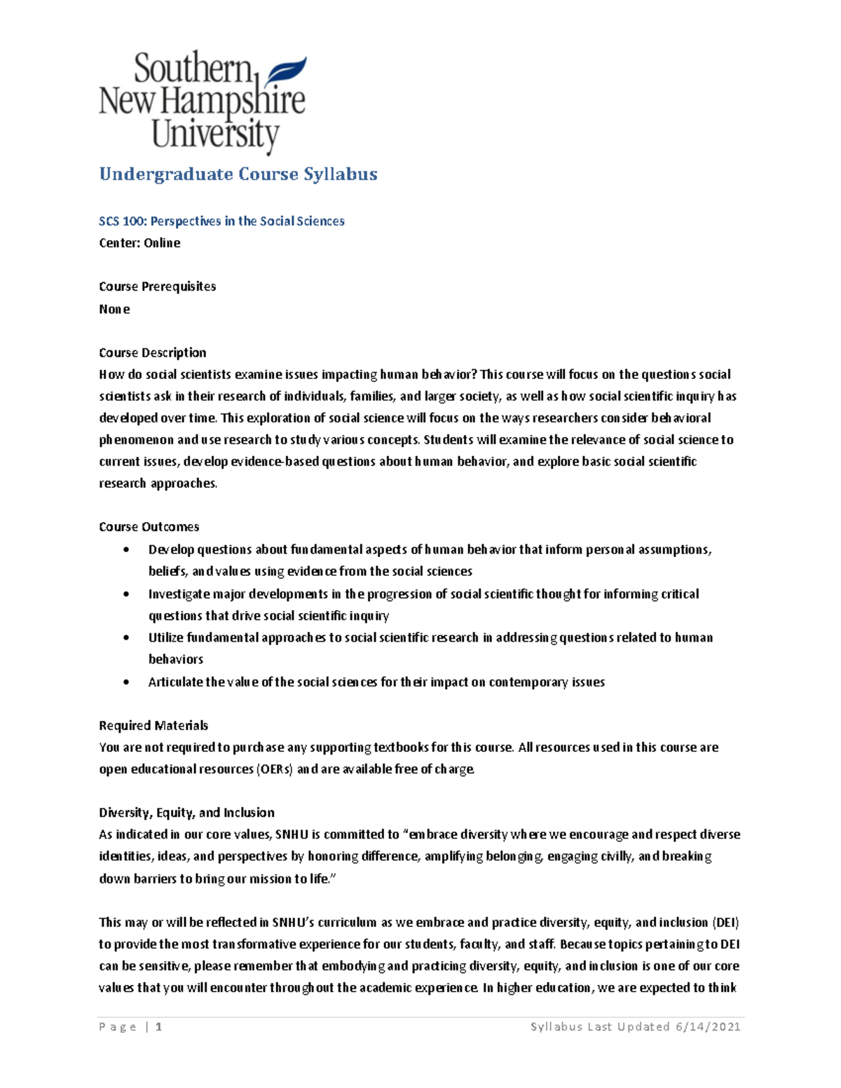 SNHU online course SCS 100 Syllabus Undergraduate Course Syllabus SCS
