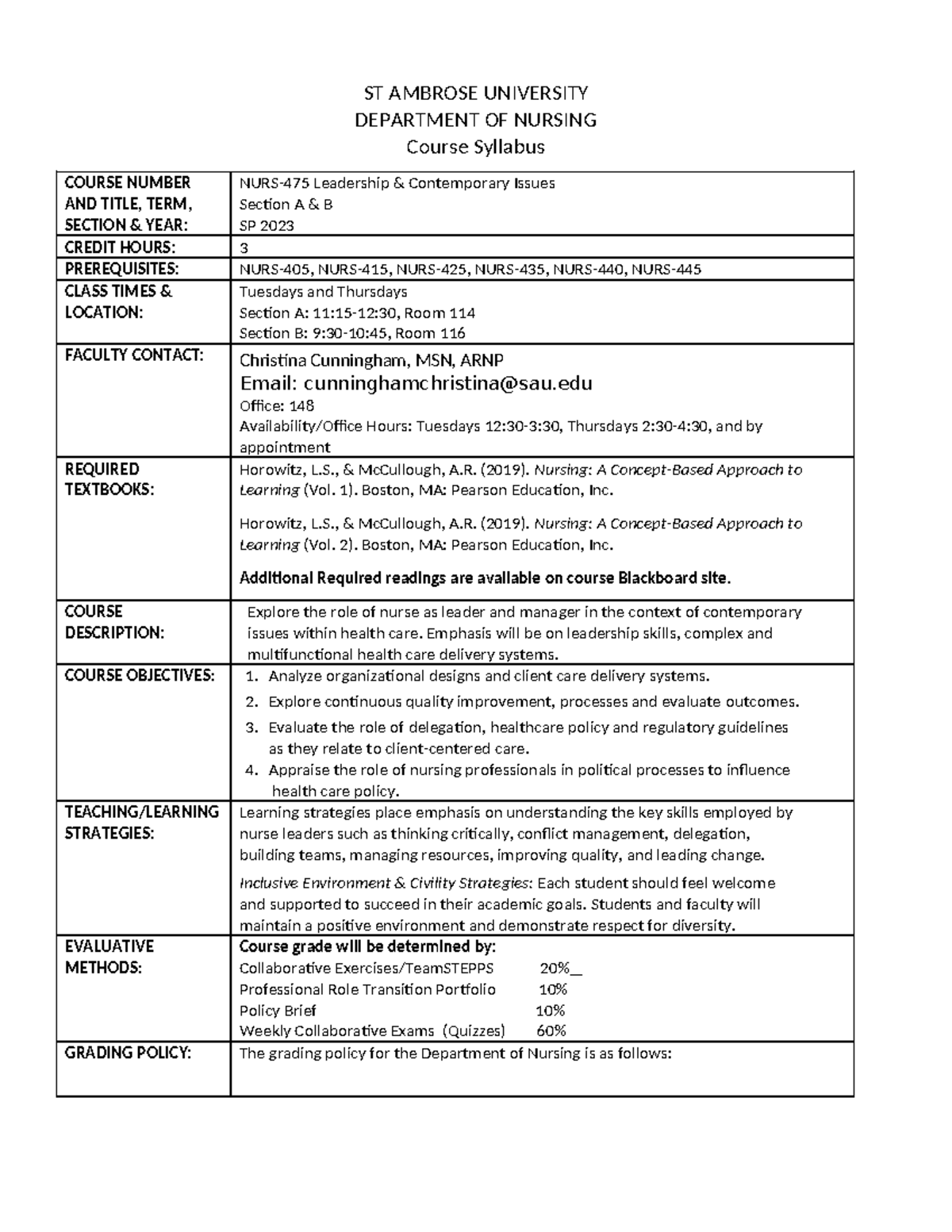 N475 SP23 Syllabus and Schedule ST AMBROSE UNIVERSITY DEPARTMENT OF