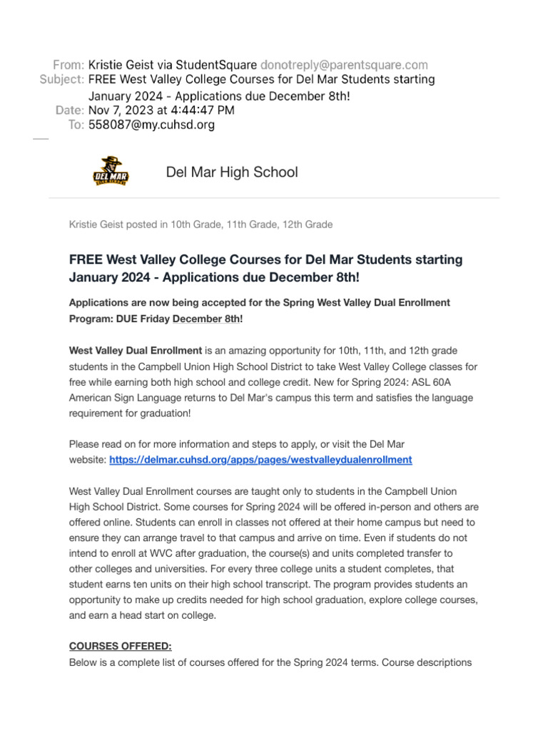 FREE West Valley College Courses for Del Mar Students Starting January