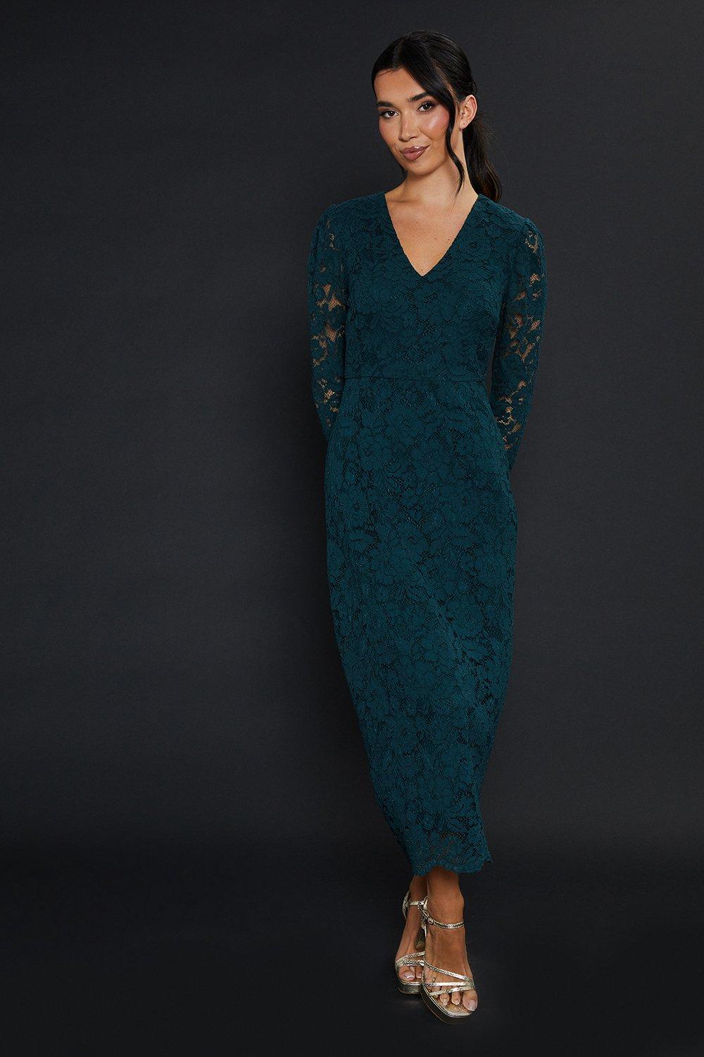 Dorothy Perkins Green Lace Long Sleeve Vneck Midi Dress PrettyLittleThing