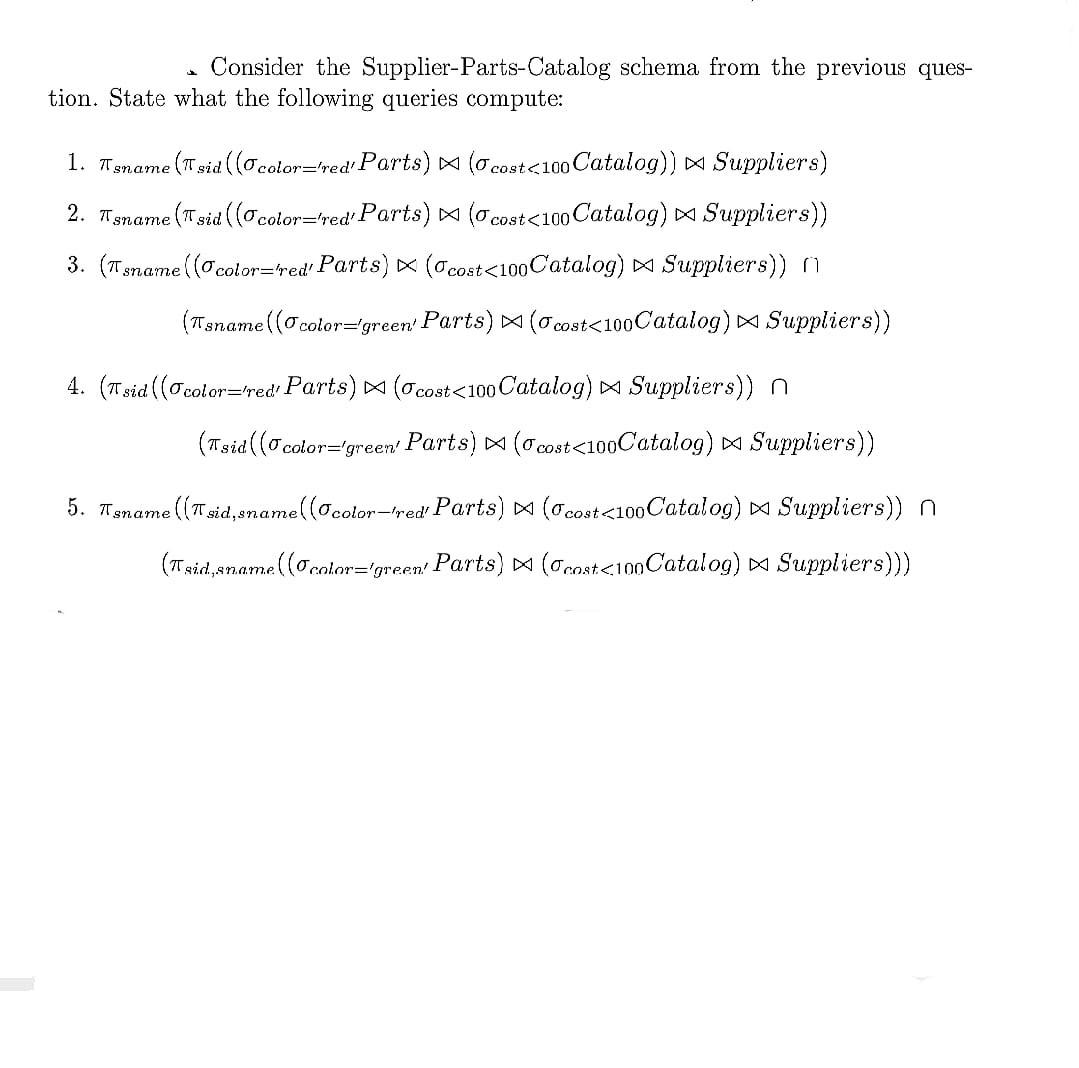 Solved Consider the following schema Supplier (sid, sname,