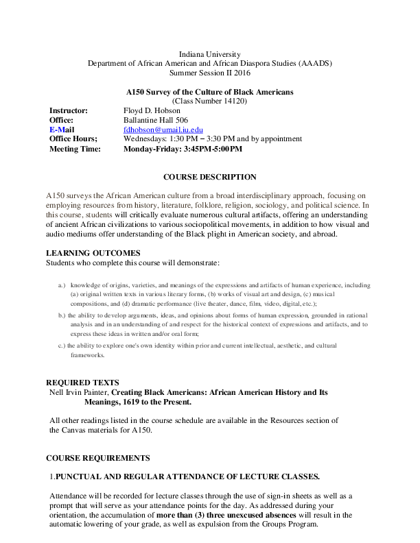 (PDF) Survey of Black Culture (A150SummerSession II) Syllabus