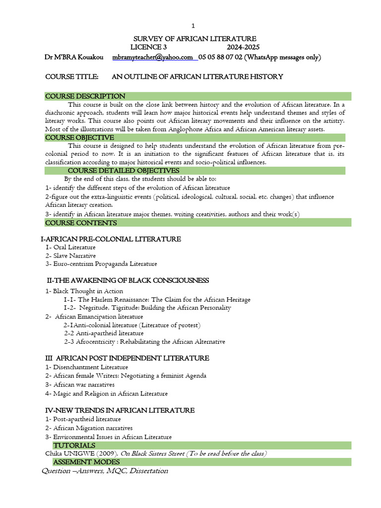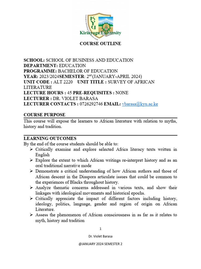 Alt 2220 Survey of African Literature January 2024 Course Outline PDF