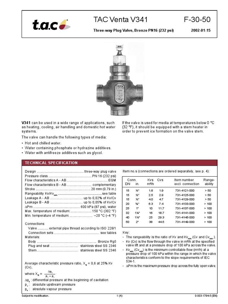 TAC Venta V341 F3050 ThreeWay Plug Valve, Bronze PN16 (232 Psi