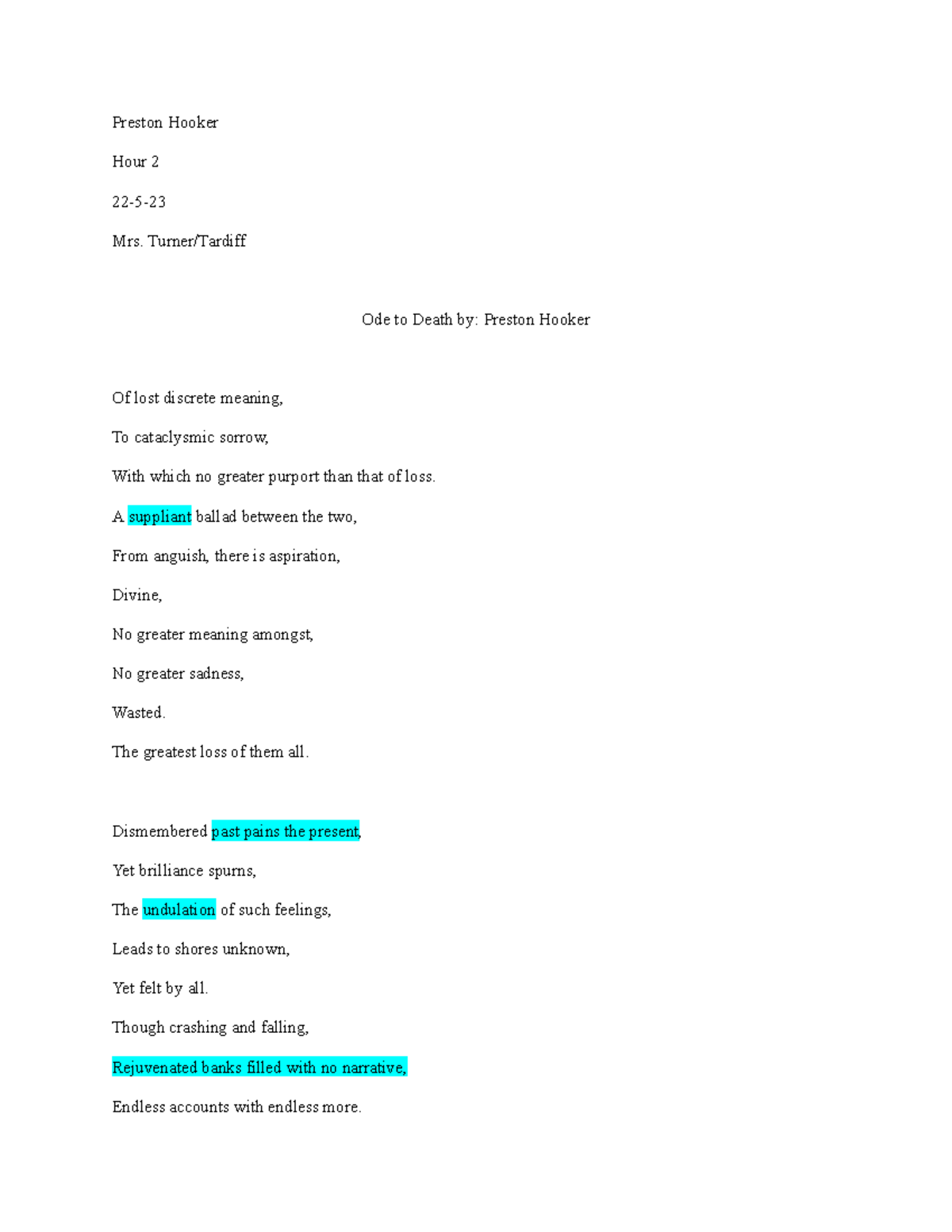 Ode Preston Hooker Hour 2 225 Mrs. Turner/Tardiff Ode to Death by