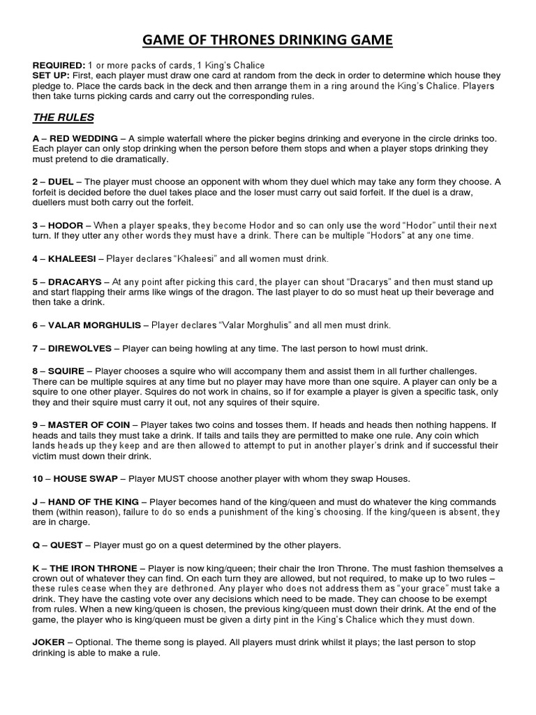The Game of Thrones Drinking Game Drinking games, Game of thrones