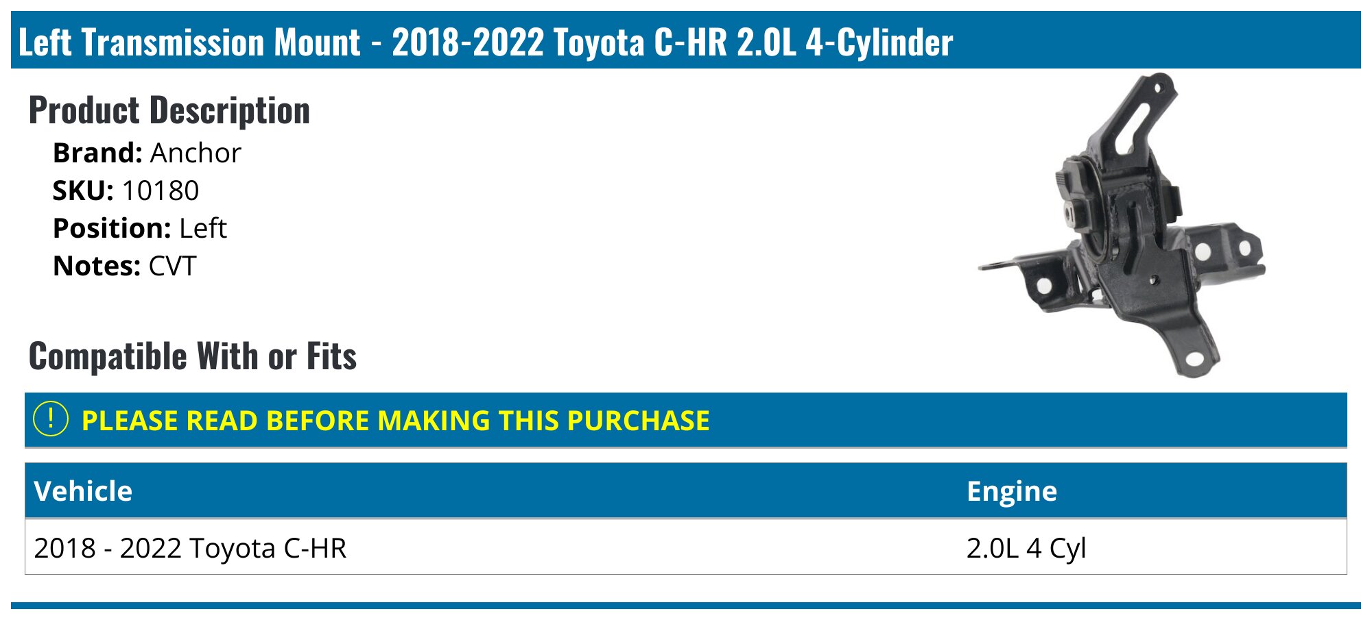 20182022 Toyota CHR Transmission Mount Anchor 10180 Left