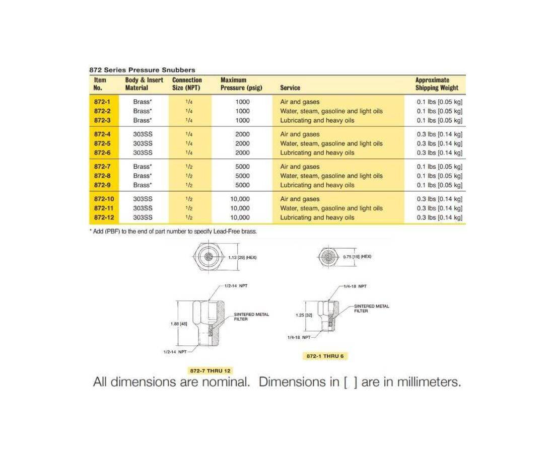 Trerice 872 Series Pressure Snubbers, Brass & 303SS Body and Impulse